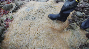 by Catherine Schmitt While out on the Damariscotta River this morning in search of wild oysters at low tide (more on that story later), we came across this giant, gelatinous mass on the shore of Goose Ledge. None of us, not even the one who is on the water every day, had ever seen anything